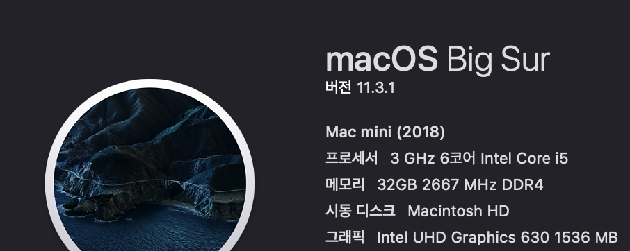 맥미니 2018, intel 3Ghz 6core i5, 32기가로 자가 업그레이드.