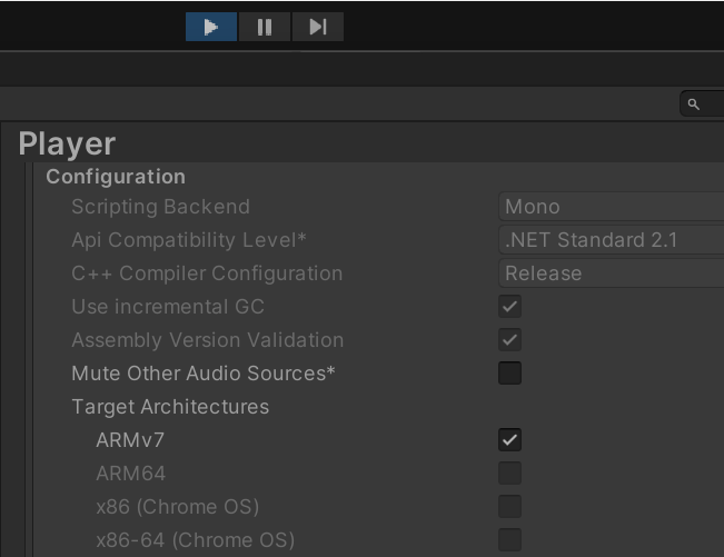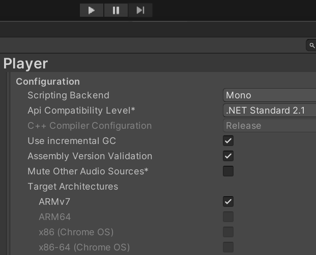 그런데 오늘 유니티 Unity 2021.3.9f1 Personal에서 그 설정을 하려고 보니, Scripting Backend 설정의 선택창이 회색으로, 선택불가능하게 disabled 되어 있었습니다.