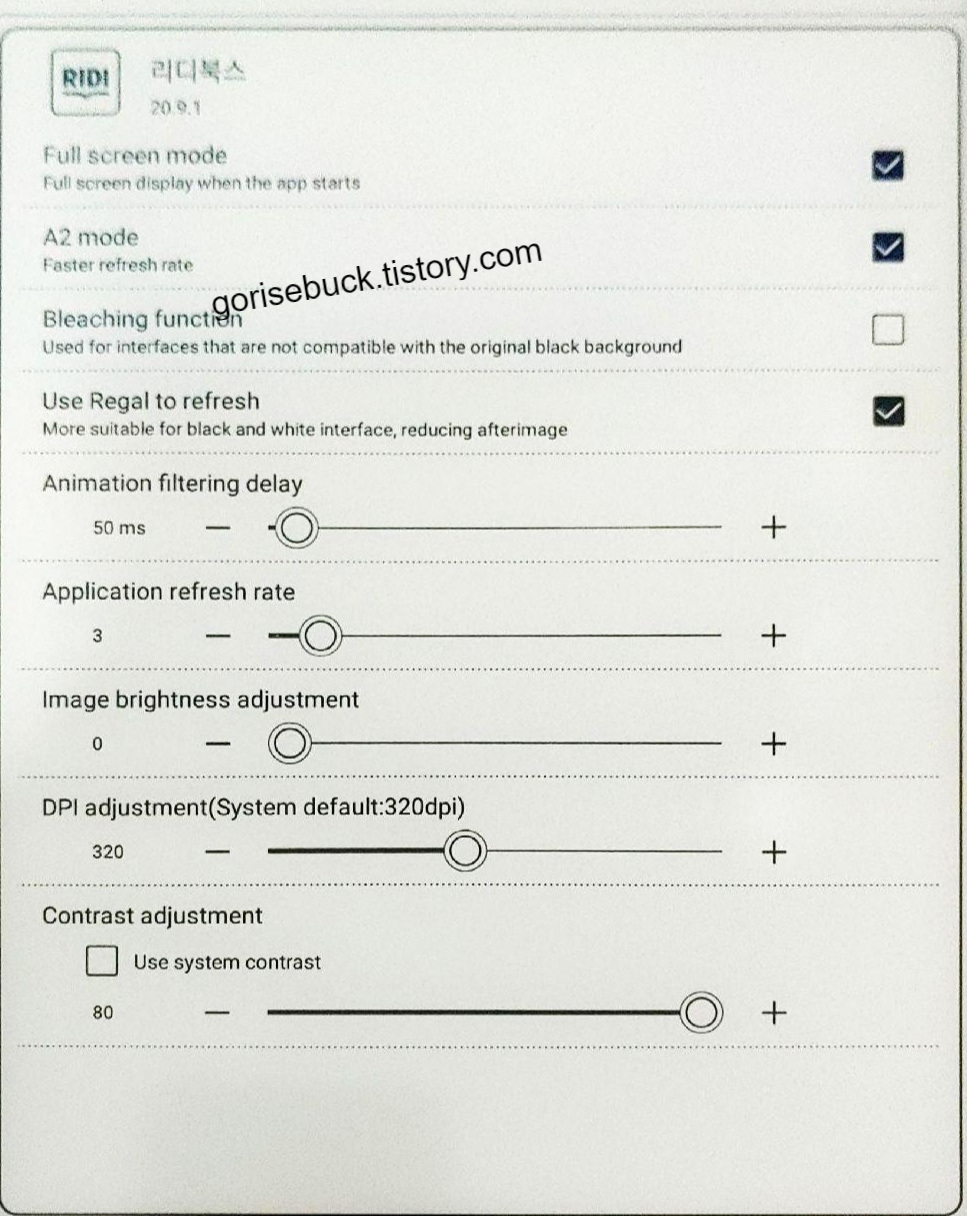 A2 mode를 켜는 것이 핵심입니다. 이걸 켜지 않으면 터치에 늦게 반응하여 갑갑한 경우가 발생하더라고요. 그런데 잔상도 많이 남습니다. 이걸 해소하기 위해 Application refresh rate 를 3으로 줄였습니다. 리프레시 속도가 빠르기 때문에 크게 불편하지 않았습니다.